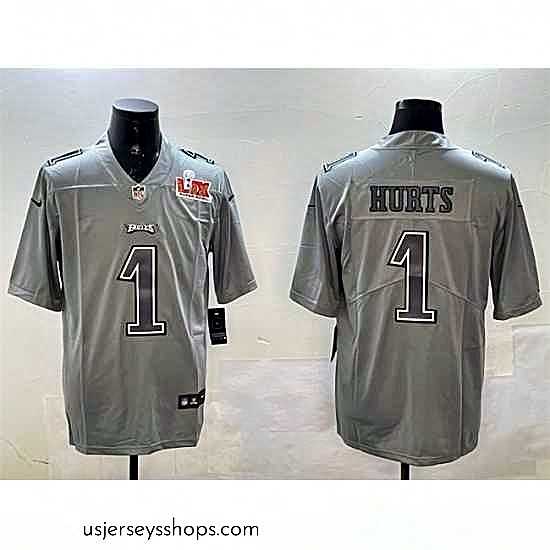 Breathtaking Philadelphia Eagles 1 Jalen Hurts Grey 2025 Super Bowl LIX Patch Atmosphere Fashion Vapor Untouchable Limited Stitched Football Jersey